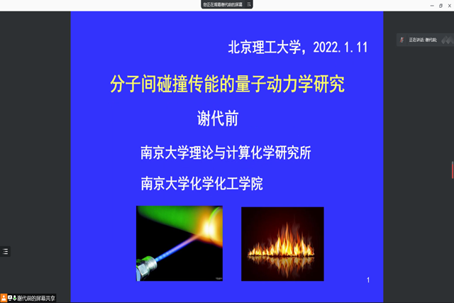 2022年1月11日下午,由taptap点点体育研究生院主办、taptap点点体育承办的北理工“百家大讲堂”系列讲座在腾讯会议上举行。南京大学谢代前教授应taptap点点体育马嘉璧副教授的邀请,做了题为“分子间碰撞传能的量子动力学研究”的学术报告。报告由马嘉璧副教授主持,二十余名师生参加了报告会并进行学术交流。