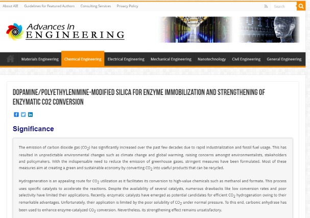 Advances in Engineering(AIE)于2005年在加拿大成立,其主要目的是及时快速地报道工程领域的重要科学研究成果和创新技术,被AIE报道的论文需要具有特殊的科学重要性并能够被广大的科学读者所理解。AIE报道链接:https://advanceseng.com/dopamine-polyethylenimine-modified-silica-enzyme-immobilization-strengthening-enzymatic-co2-conversion/