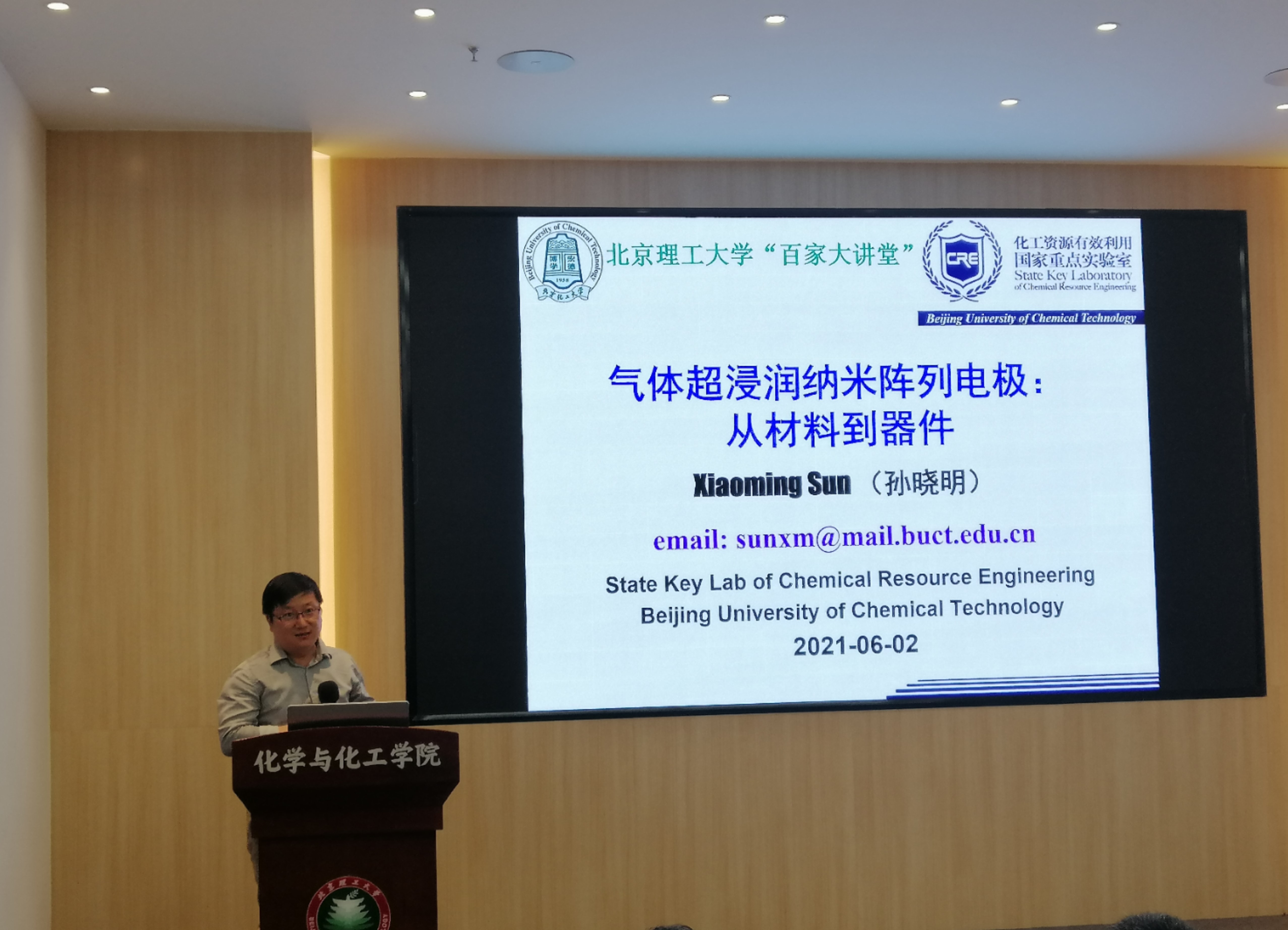 应taptap点点体育邀请,北京化工大学孙晓明教授于2021年6月2日下午14:30在良乡校区工业生态楼118报告厅,作了题为“气体超浸润纳米阵列电极”的精彩学术报告。报告由杨国昱老师主持,近百名化院师生参加了报告。